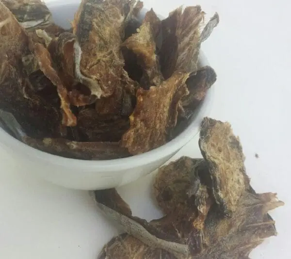 Air dried Mackerel pieces are stringy, chewy bite sized piece of fish and the pieces are very fibrous and can be broken down in your hands.